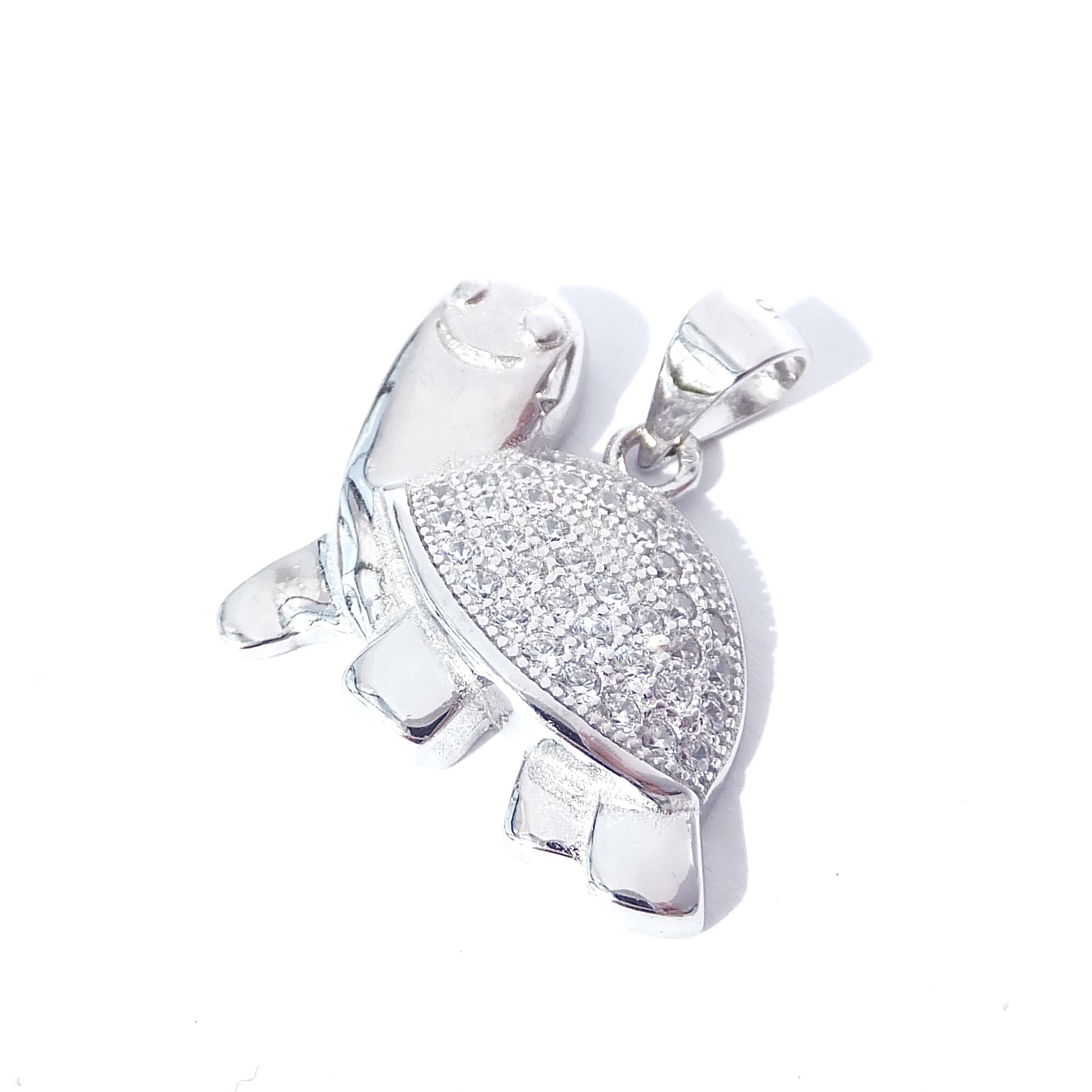 Roztomilý stříbrný přívěsek v podobě želvy. Přívěsek je zdobený čirými kamínky.