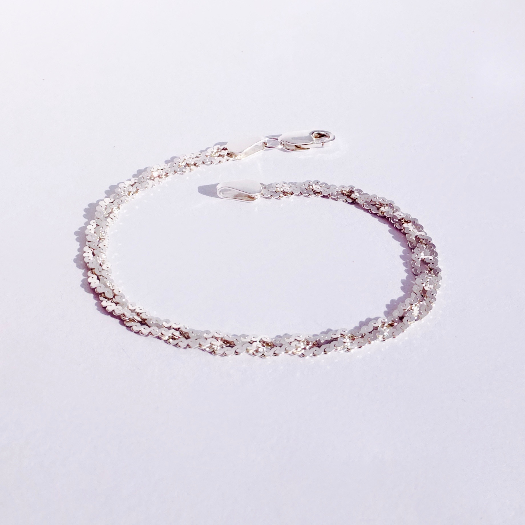 Stříbrný náramek tvořený ze tří tenkých náramků propletených do jednoho krásného celku, který ozdobí Vaši ruku. Zapínání je klasické na karabinku.