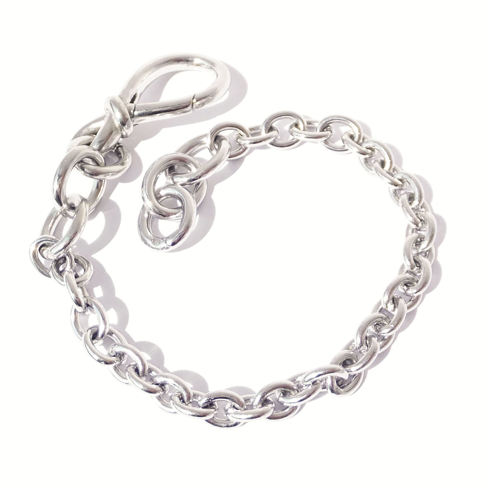 Stříbrný náramek se zapínáním na karabinku.