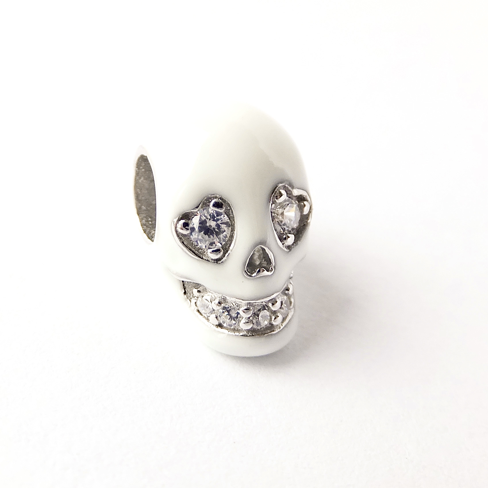 Stříbrný přívěsek na náramek ve tvaru lebky, která v noci svítí. Přívěsek je zdoben čirými kamínky. Úžasné, detailní zpracování.