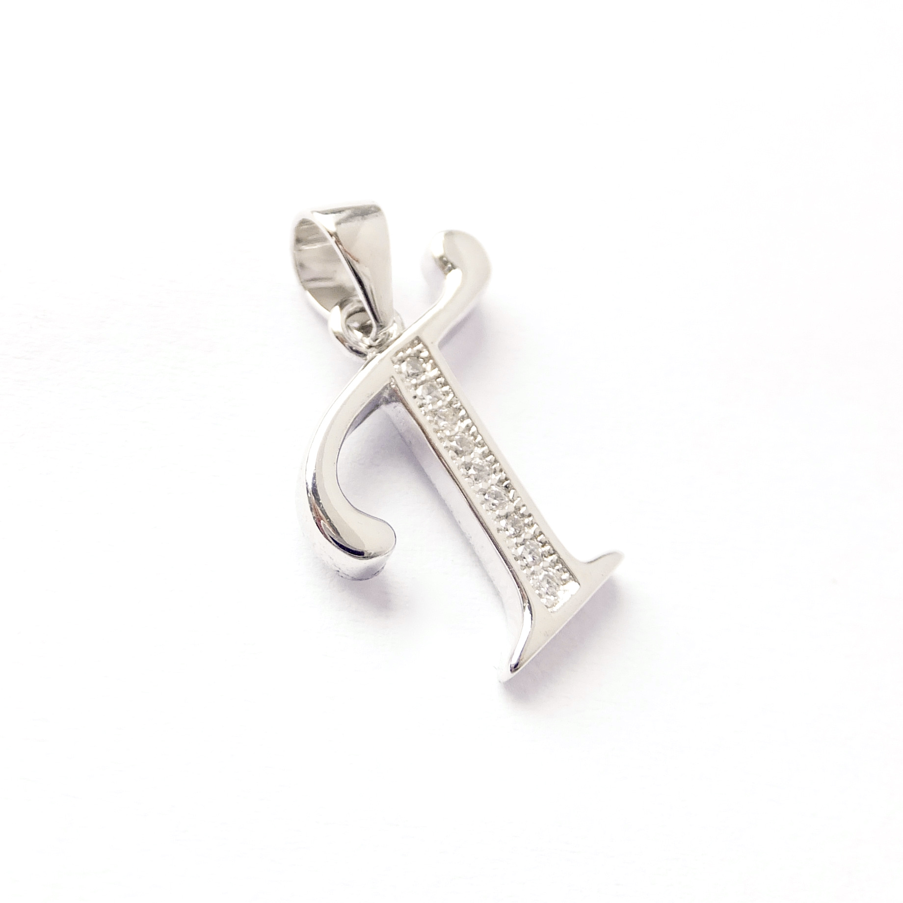 Elegantní stříbrný přívěsek ve tvaru písmena T. Přívěsek je zdobený čirými kamínky.