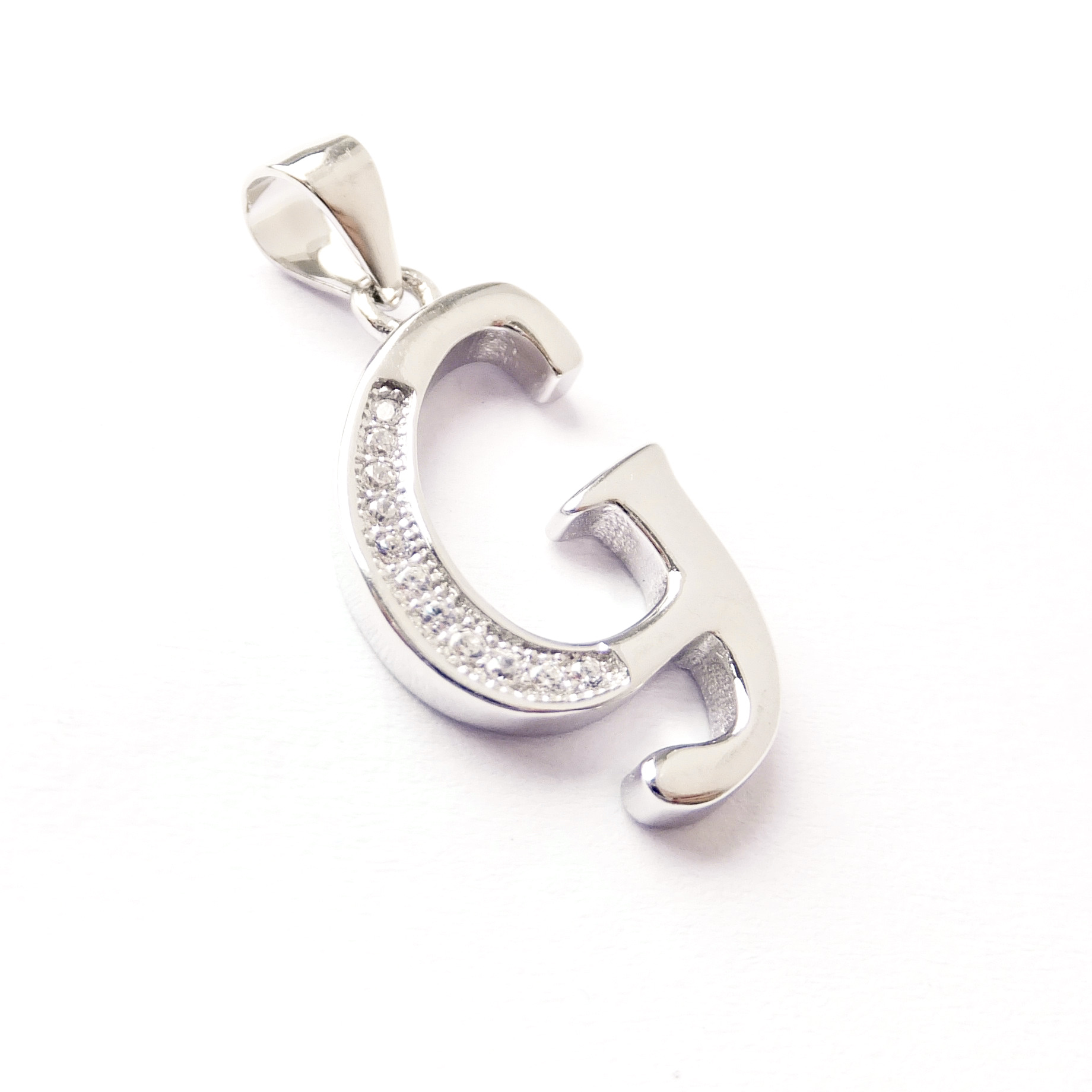 Elegantní stříbrný přívěsek ve tvaru písmena G. Přívěsek je zdobený čirými kamínky.