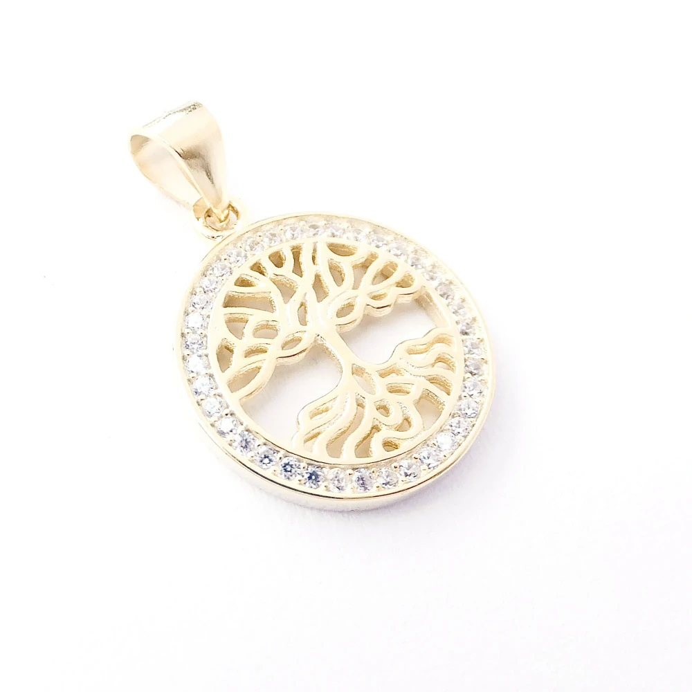 Elegantní stříbrný pozlacený přívěsek ve tvaru stromu života, který je zdobený čirými kamínky.