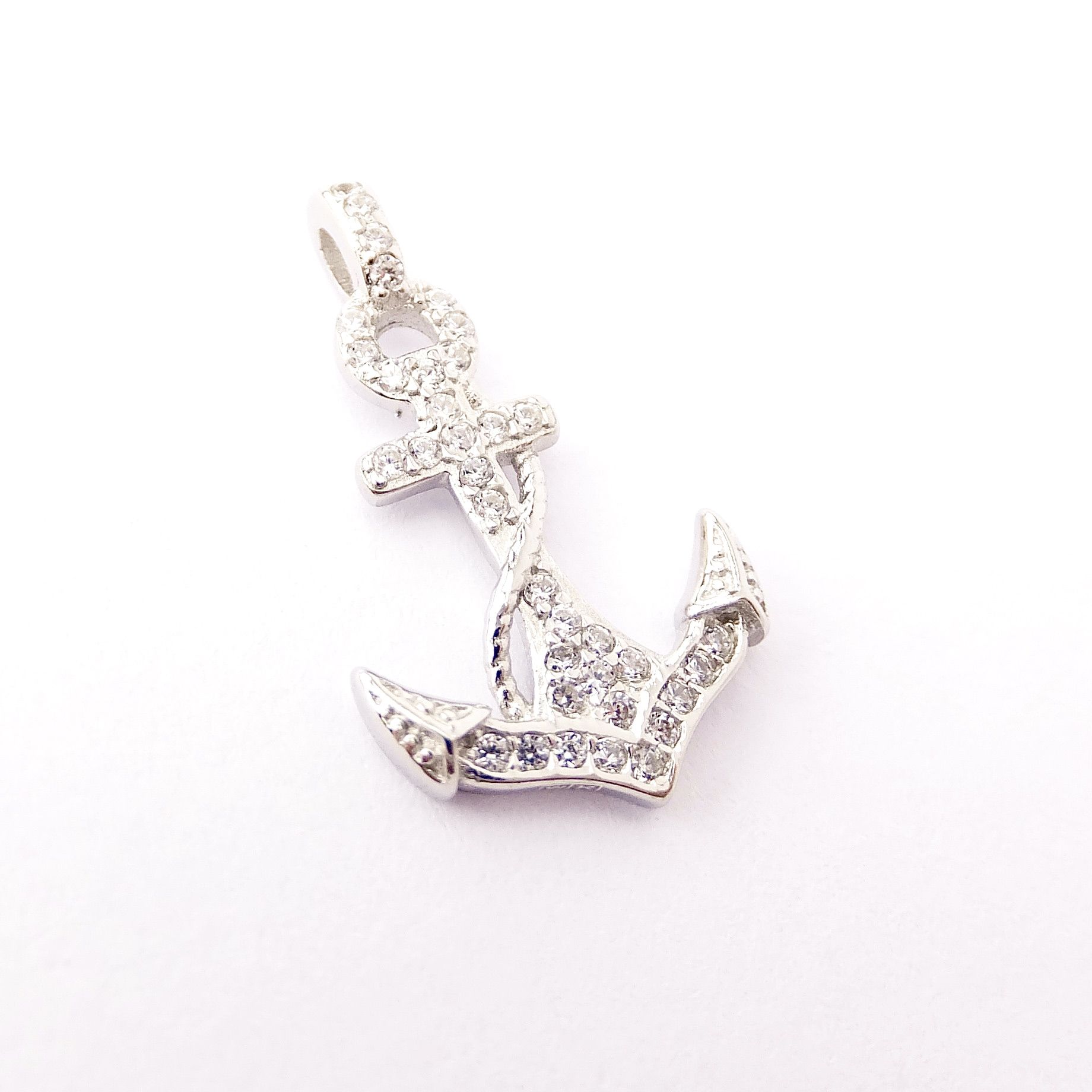 Lesklý stříbrný přívěsek ve tvaru kotvy s čirými kamínky. Ideální k tenkému řetízku.