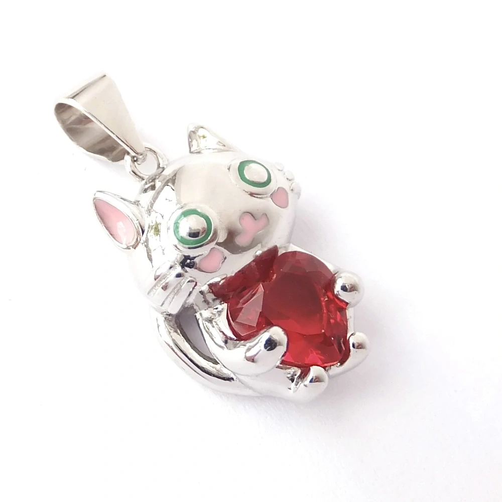 Stříbrný lesklý přívěsek v podobě roztomilé kočky, která drží červený kámen.