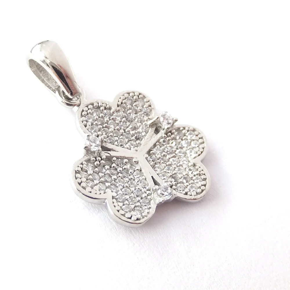 Stříbrný přívěsek ve tvaru trojlístku. Přívěsek je zdobený čirými kamínky.