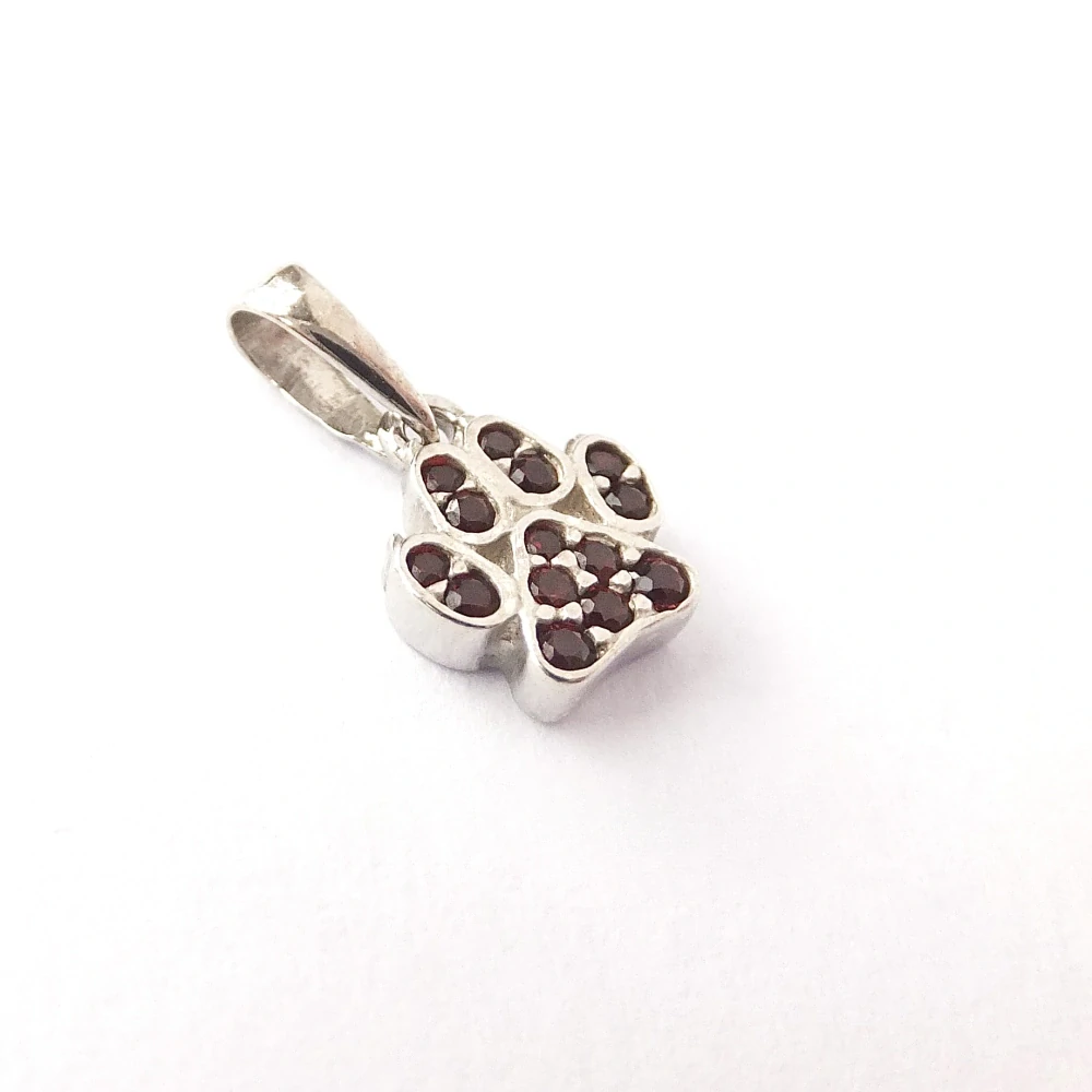 Stříbrný rhodiovaný přívěsek ve tvaru tlapky s přírodními granáty. Možnost koupě stejných náušnic a prstenu- M855, M856.