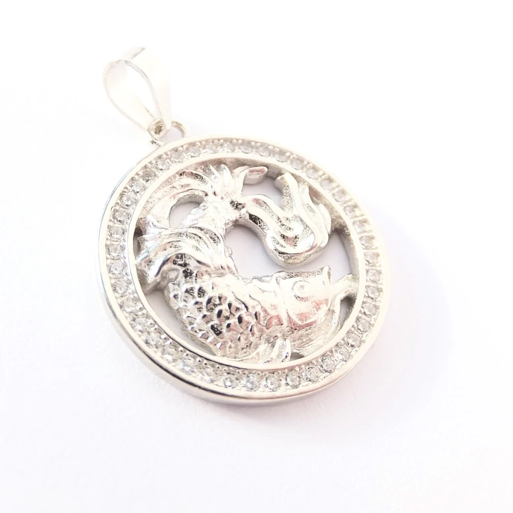 Krásně zpracovaný stříbrný přívěsek se znamenímm zvěrokruhu Ryby. Přívěsek je okolo dekorován čirými zirkony.