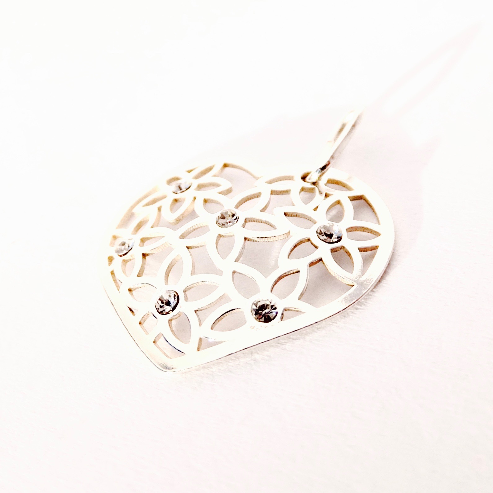 Stříbrný drobný přívěšek ve tvaru srdíčka, které je zdobené čirými kamínky. Jemný přívěšek, které má boční uchycení.