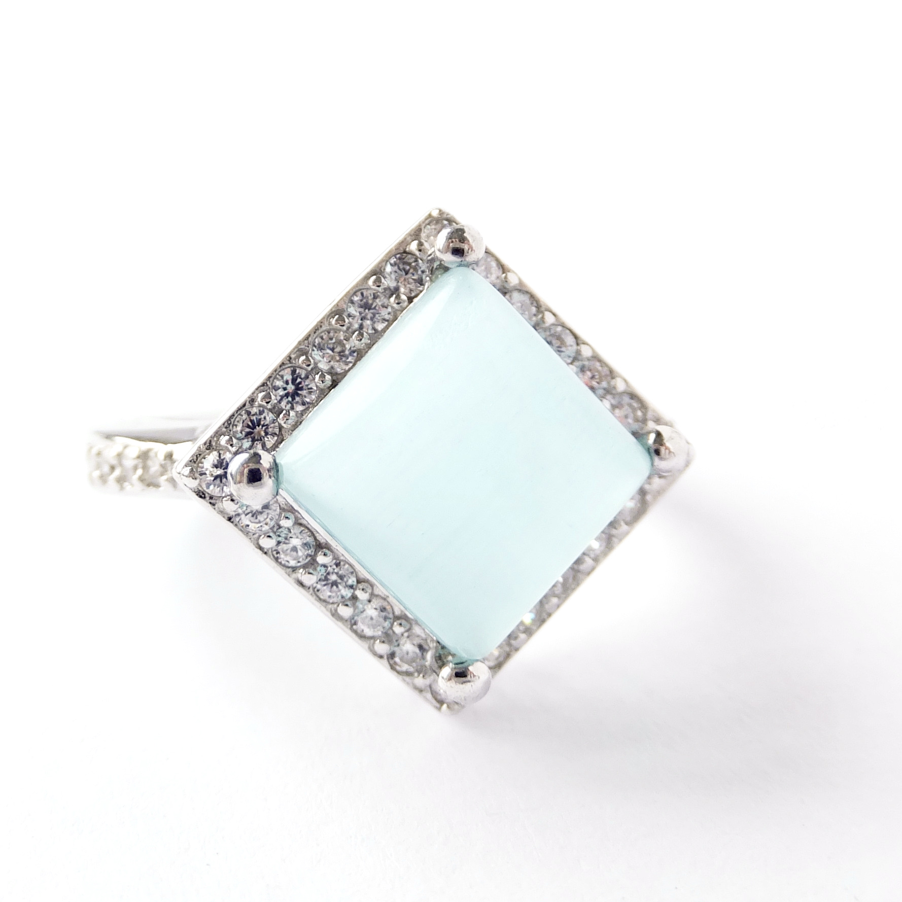 Nádherný stříbrný prsten s modrým kamenem a čirými kamínky.