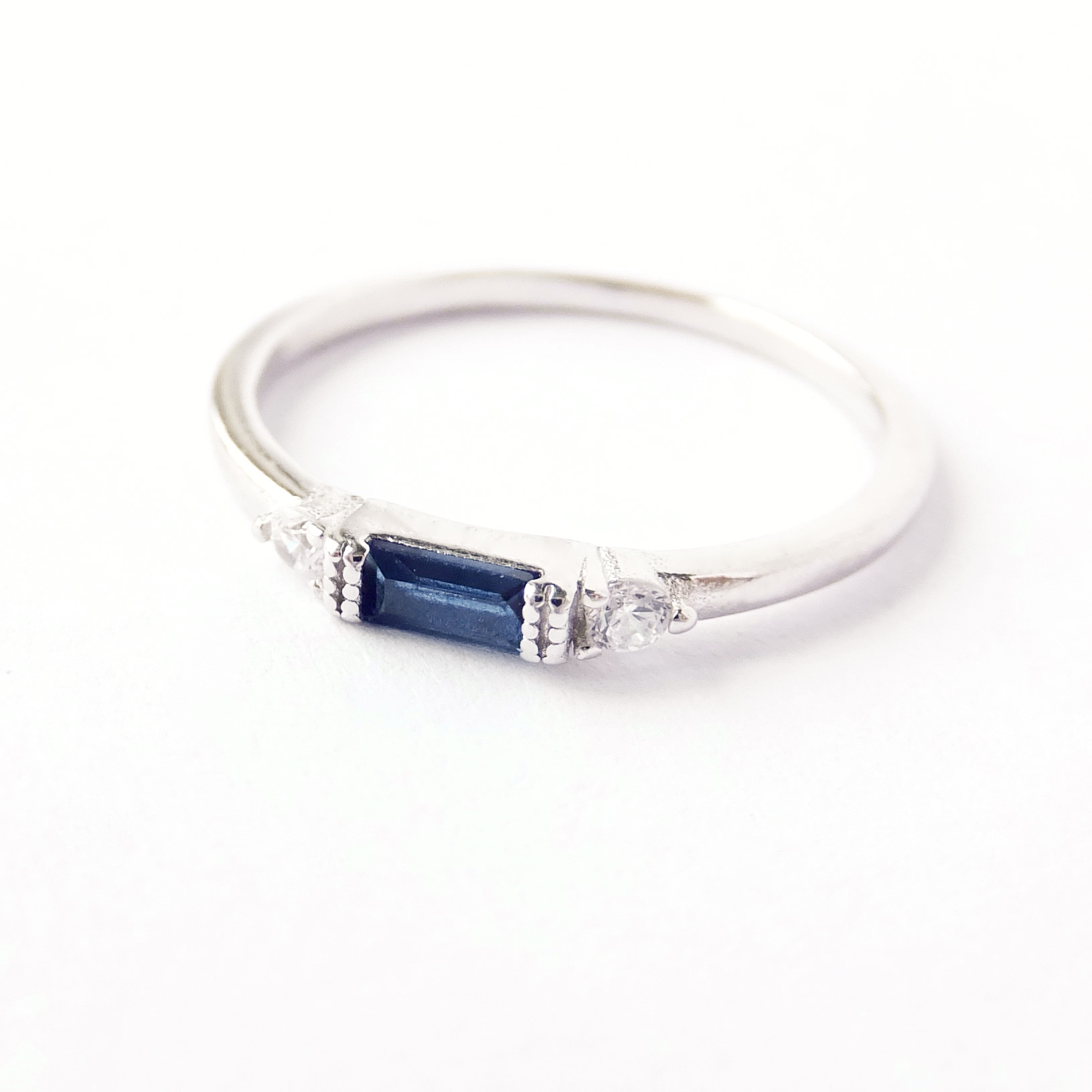 Jemný stříbrný prsten zdobený tmavě modrým kamínkem a čirými kamínky.