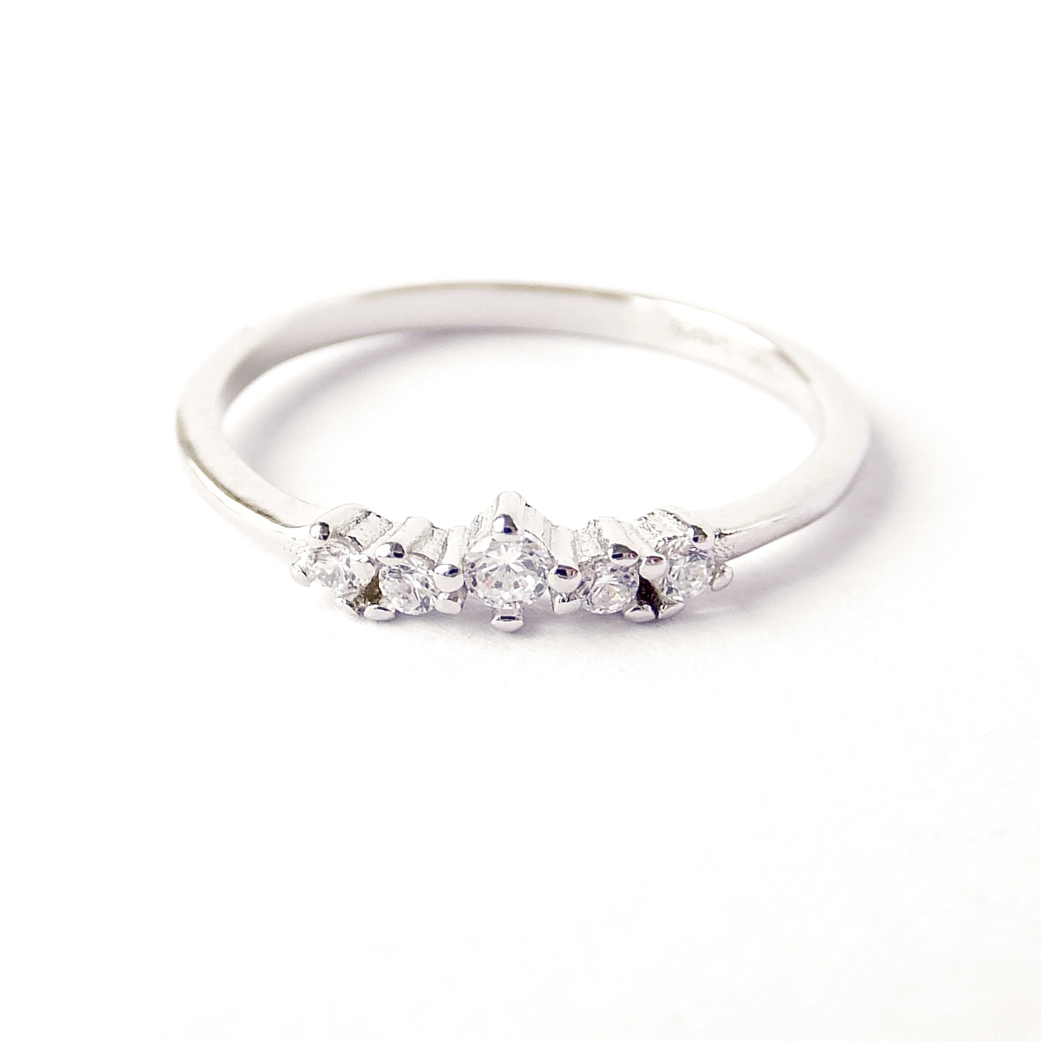 Jemný stříbrný prsten s drobnými, čirými kamínky.