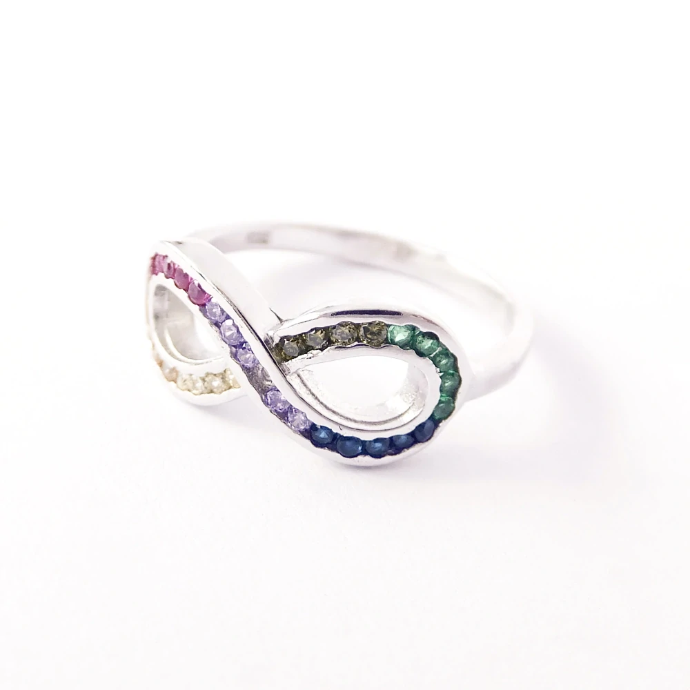 Krásný stříbrný prsten ve tvaru nekonečna s barevnými kamínky.