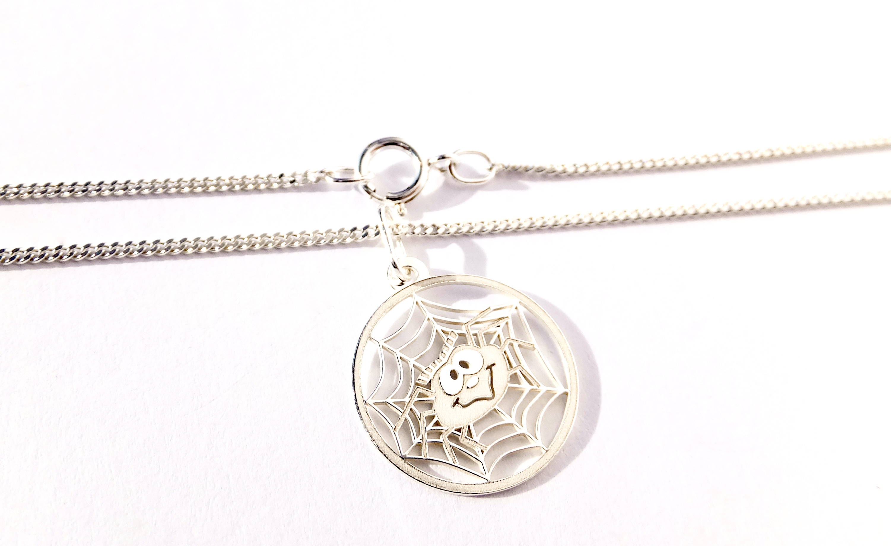 Stříbrný tenký řetízek dekorován přívěskem ve tvaru pavučinky s pavoukem. Kroužkové zapínání.