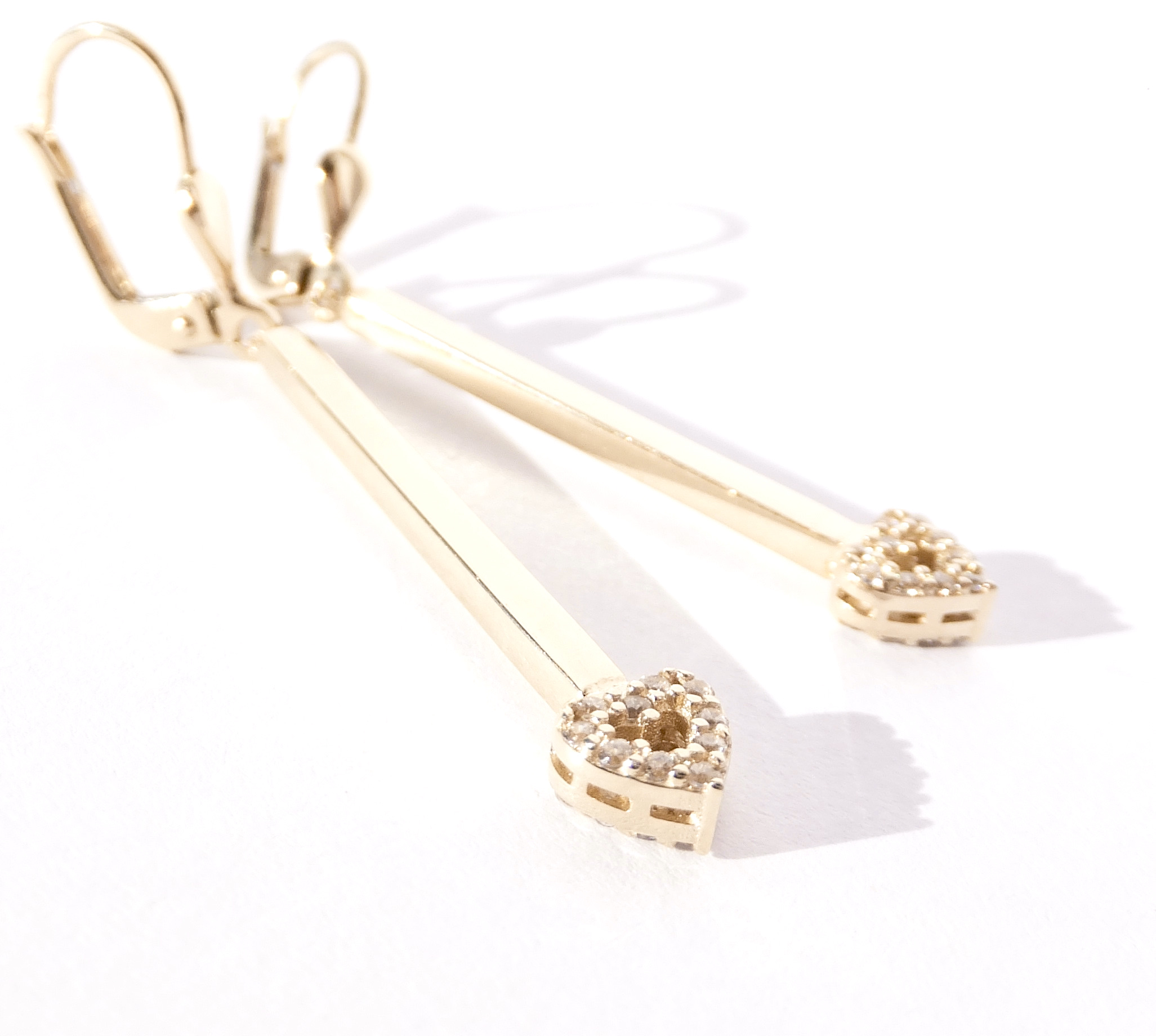 Nádherné zlaté visací náušnice se srdíčky na konci. Srdíčka jsou zdobená čirými zirkony. Zapínání na patent-klapka.