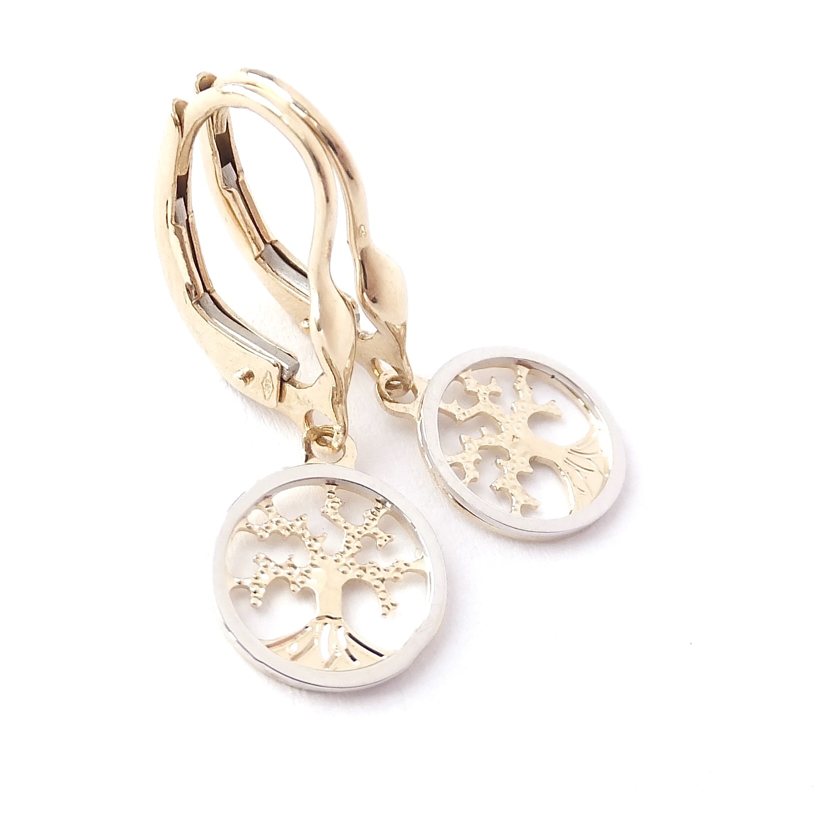 Elegantní zlaté náušnice se stromem života. Pohodlné zapínání na patent-klapka.