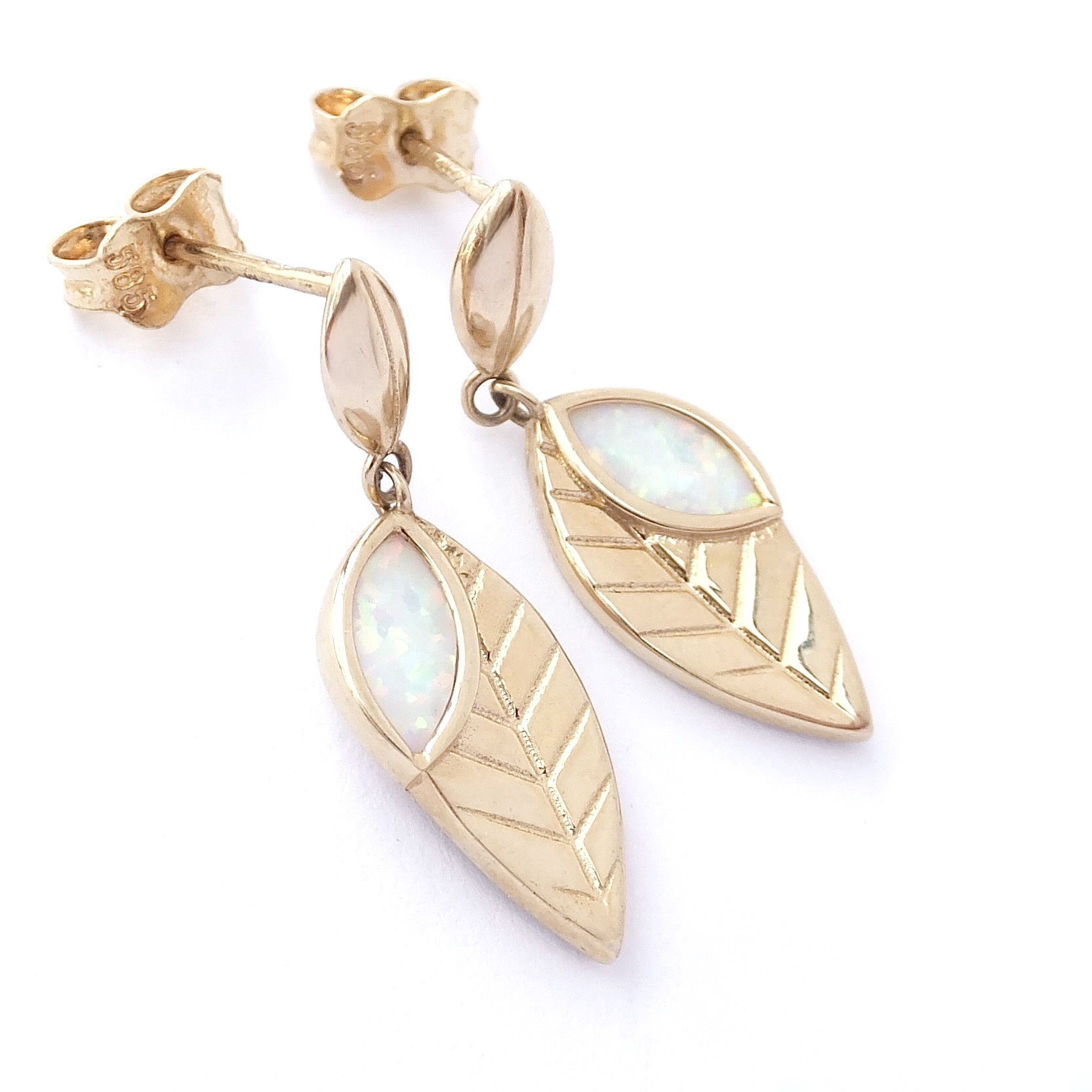 Elegantní zlaté visací náušnice se syntetickým opálem. Pohodlné zapínání na puzetu. Možnost koupě stejného náhrdelníku, který naleznete pod číslem K894.