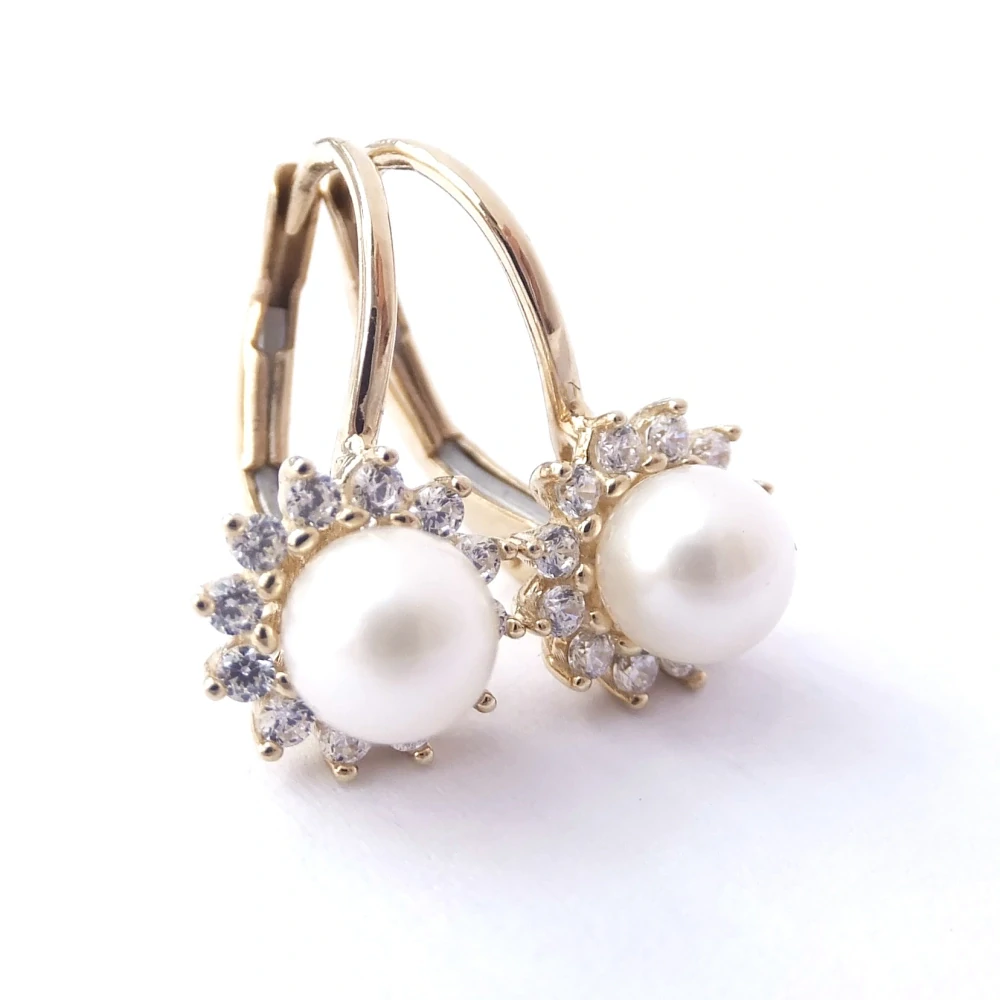 Okouzlující zlaté náušnice zdobené perlami a čirými zirkony. Společně utvářejí tvar květíny. Pohodlné zapínání na patent-klapka.