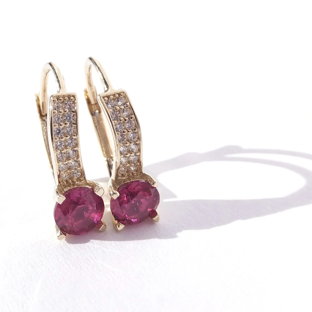 Elegantní zlaté náušnice se sytě růžovými kameny a čirými zirkony. Pohodlné zapínání na patent-klapka.