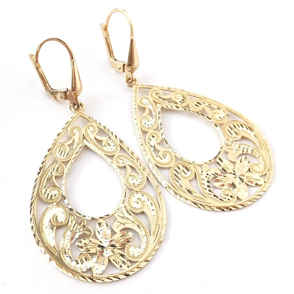 Nádherné visací zlaté náušnice s lesklou povrchovou úpravou. Ideální šperk do společnosti. Pohodlné zapínání na patent-klapka.