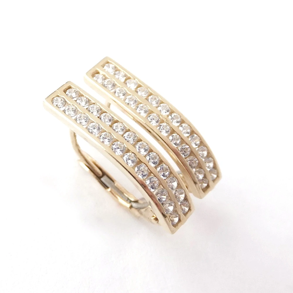 Elegantní zlaté náušnice zdobené čirými zirkony. Pohodlné zapínání na patent-klapka.