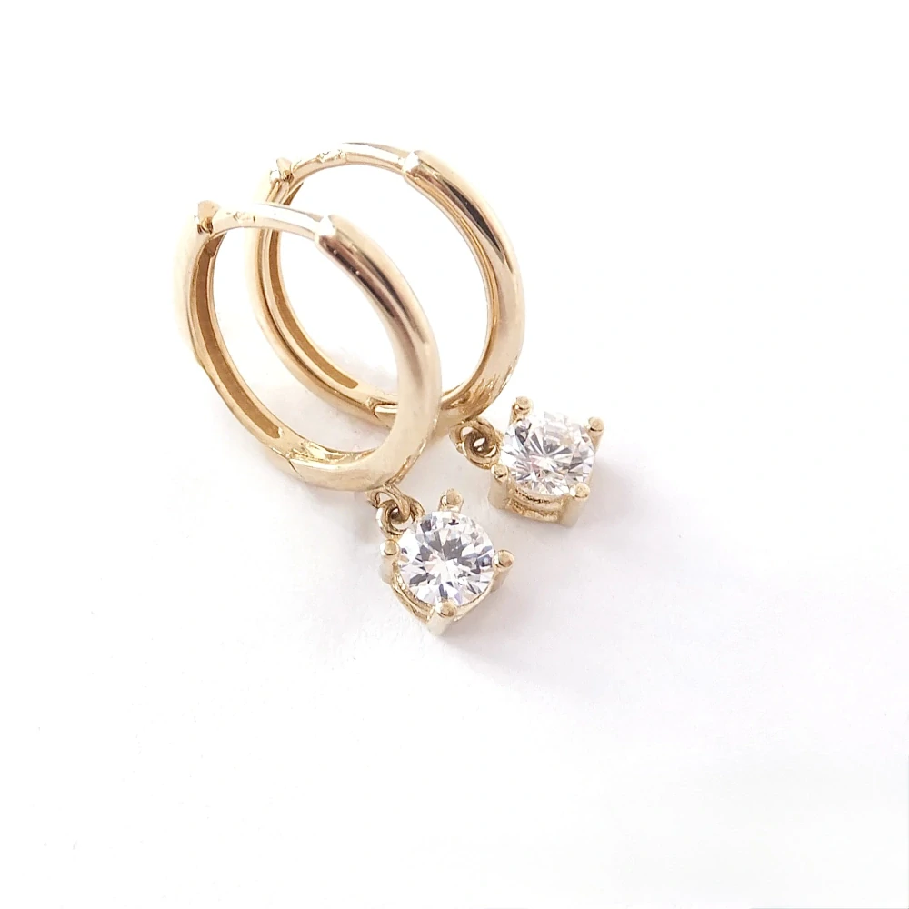 Krásné zlaté náušnice kruhového tvaru s ozdobou s čirými zirkony. Zapínání na zacvaknutí.