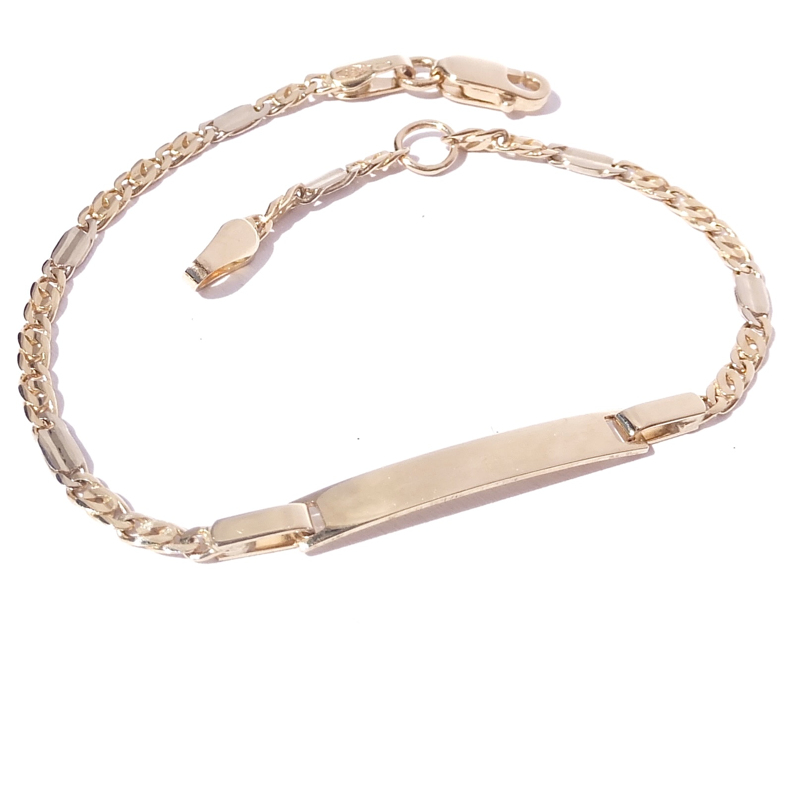 Zlatý dětský dutý náramek s ozdobnou destičkou s možností gravírování. Kroužkové zapínání.