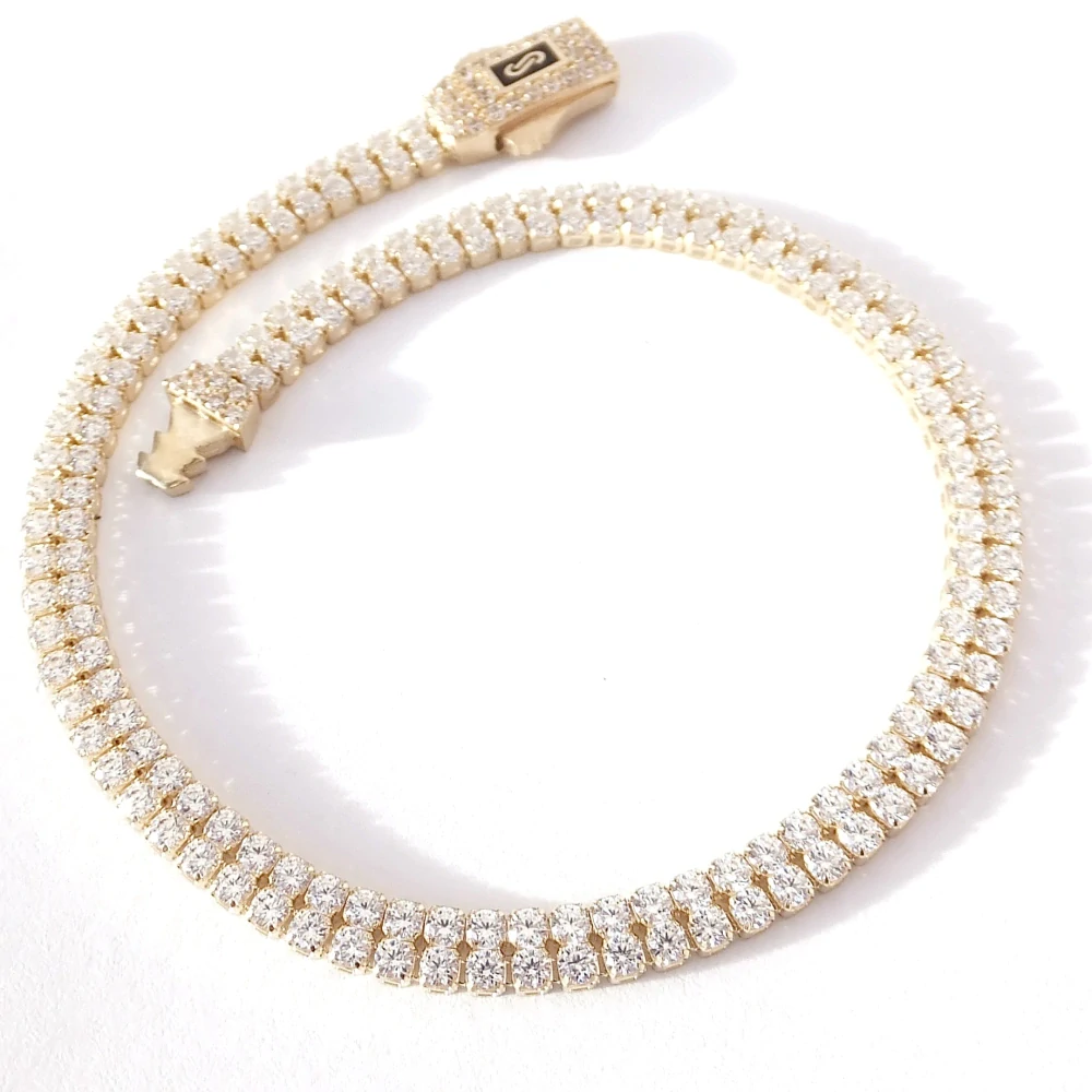Elegantní zlatý náramek zdobený čirými zirkony, které se dokonale třpytí.