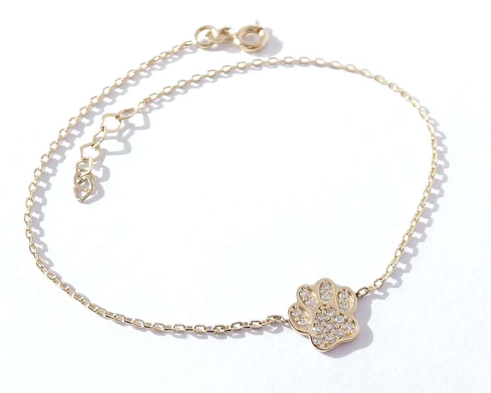 Jemný zlatý náramek doplněný přívěskem ve tvaru tlapky. Přívěsek ve tvaru tlapky je zdobený z přední strany čirými zirkony. Kroužkové zapínání.