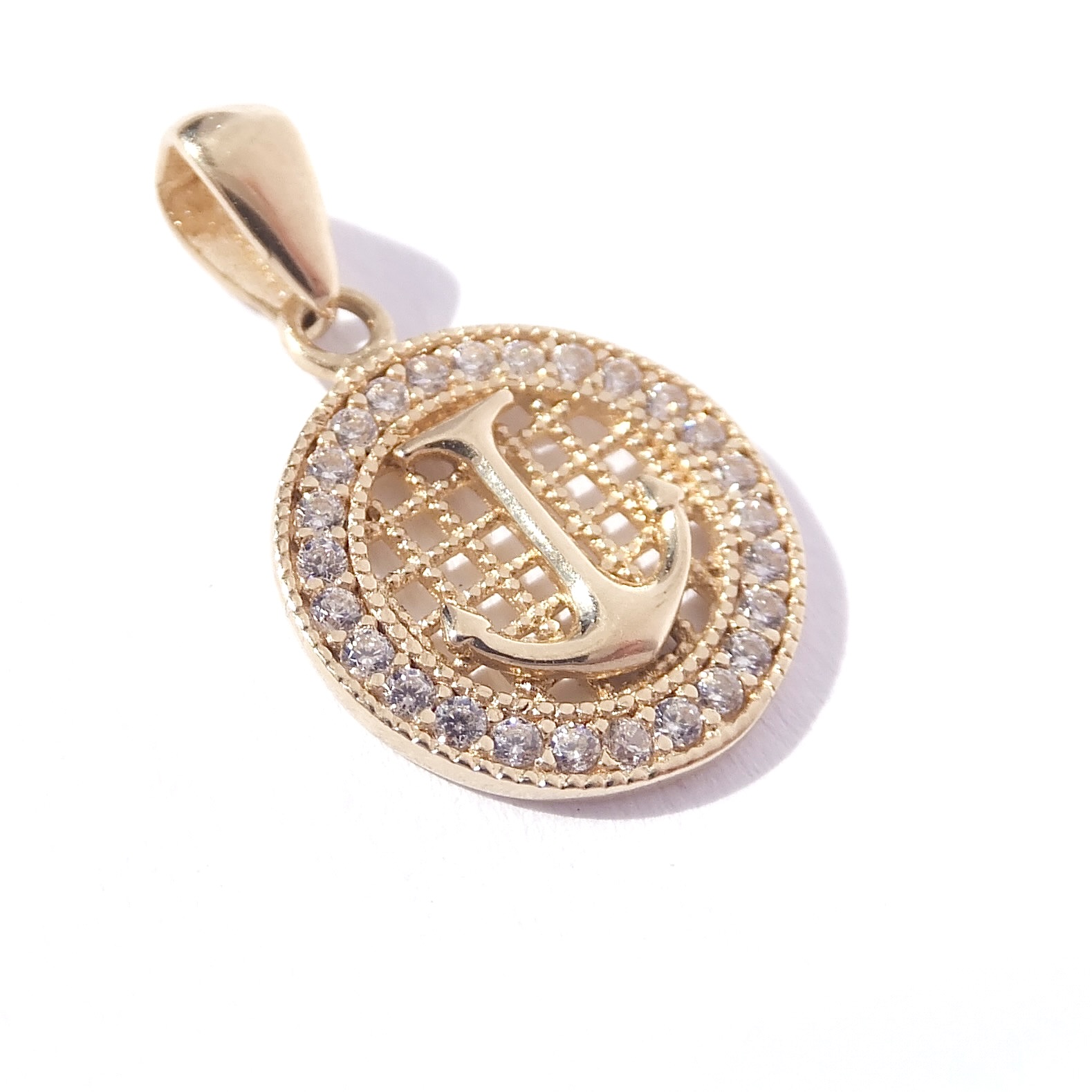 Zlatý přívěsek s kotvou. Přívěsek je zdobený čirými zirkony.