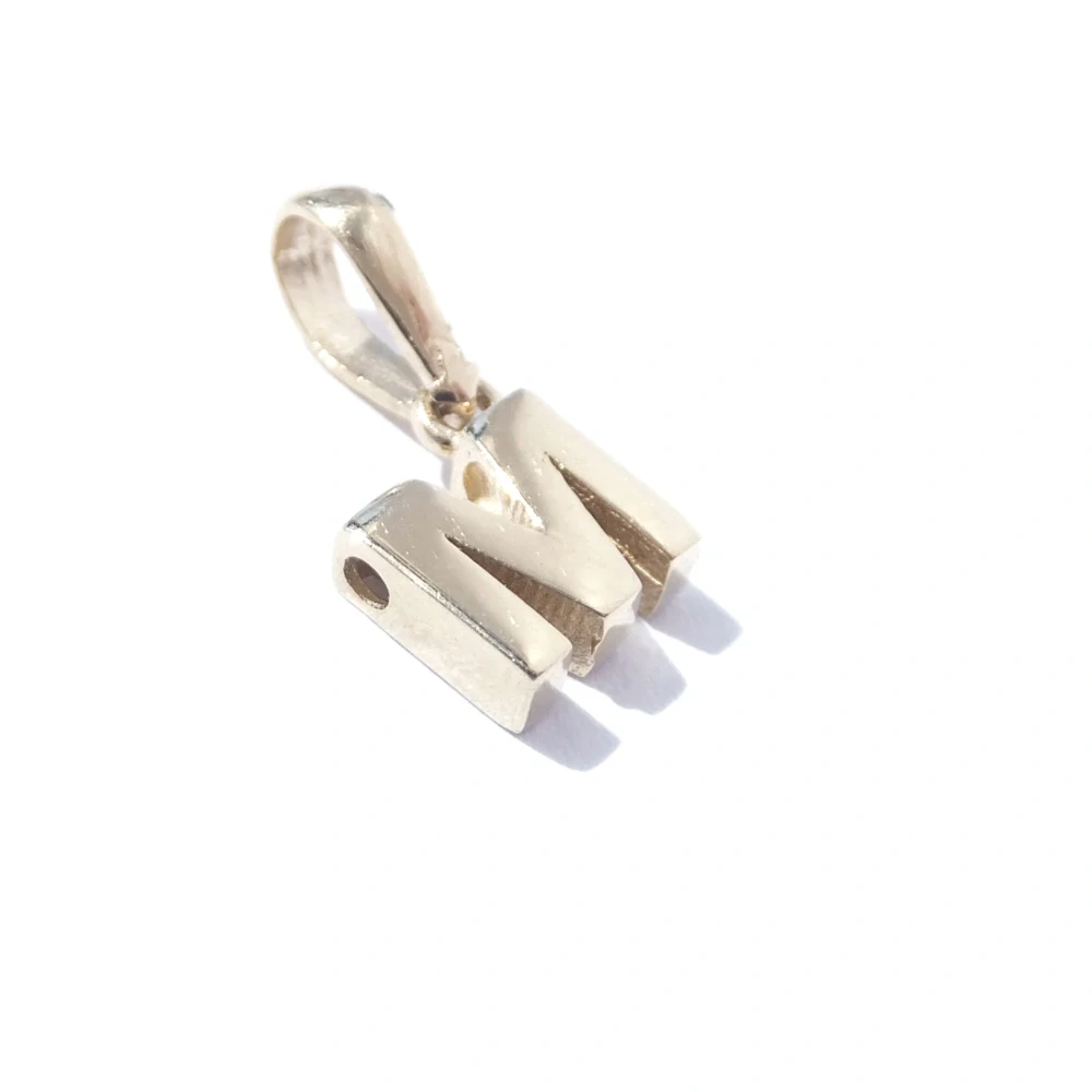 Drobný zlatý přívěsek ve tvaru písmena M. Minimalistický šperk, který se bude krásně vyjímat na tenkém řetízku.