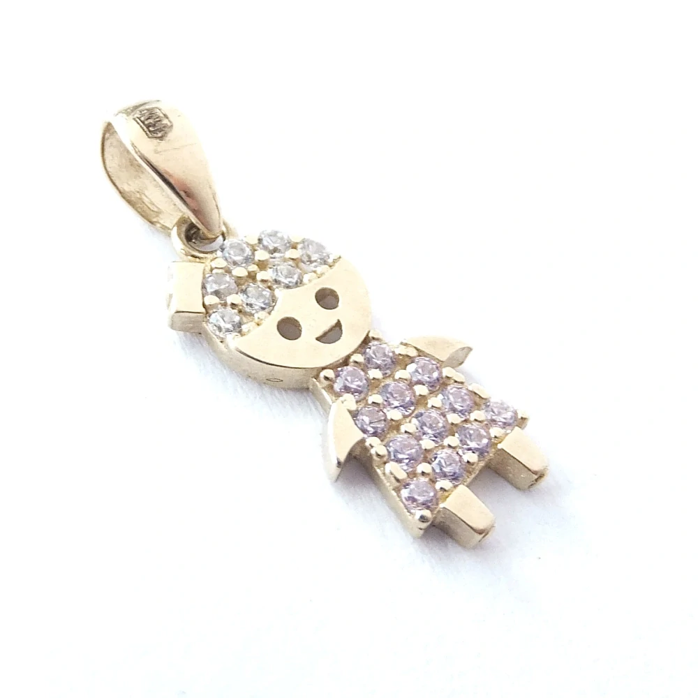 Roztomilý zlatý přívěsek v podobě holčičky. Přívěsek je doplněný světle růžovými a čirými zirkony.