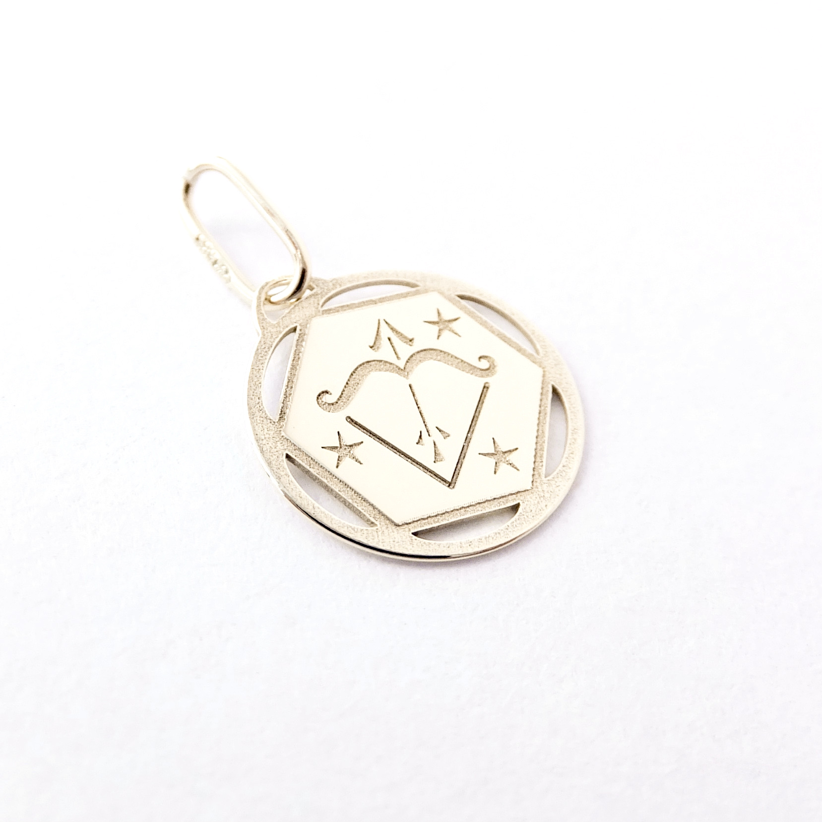Drobný zlatý přívěsek se znamením zvěrokruhu Střelec.