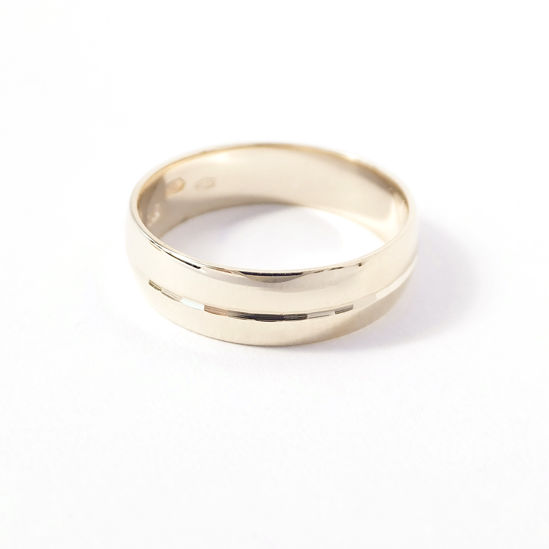 Zlatý snubní prsten se třpytivou linií uprostřed. Prsten má lesklou povrchovou úpravou.