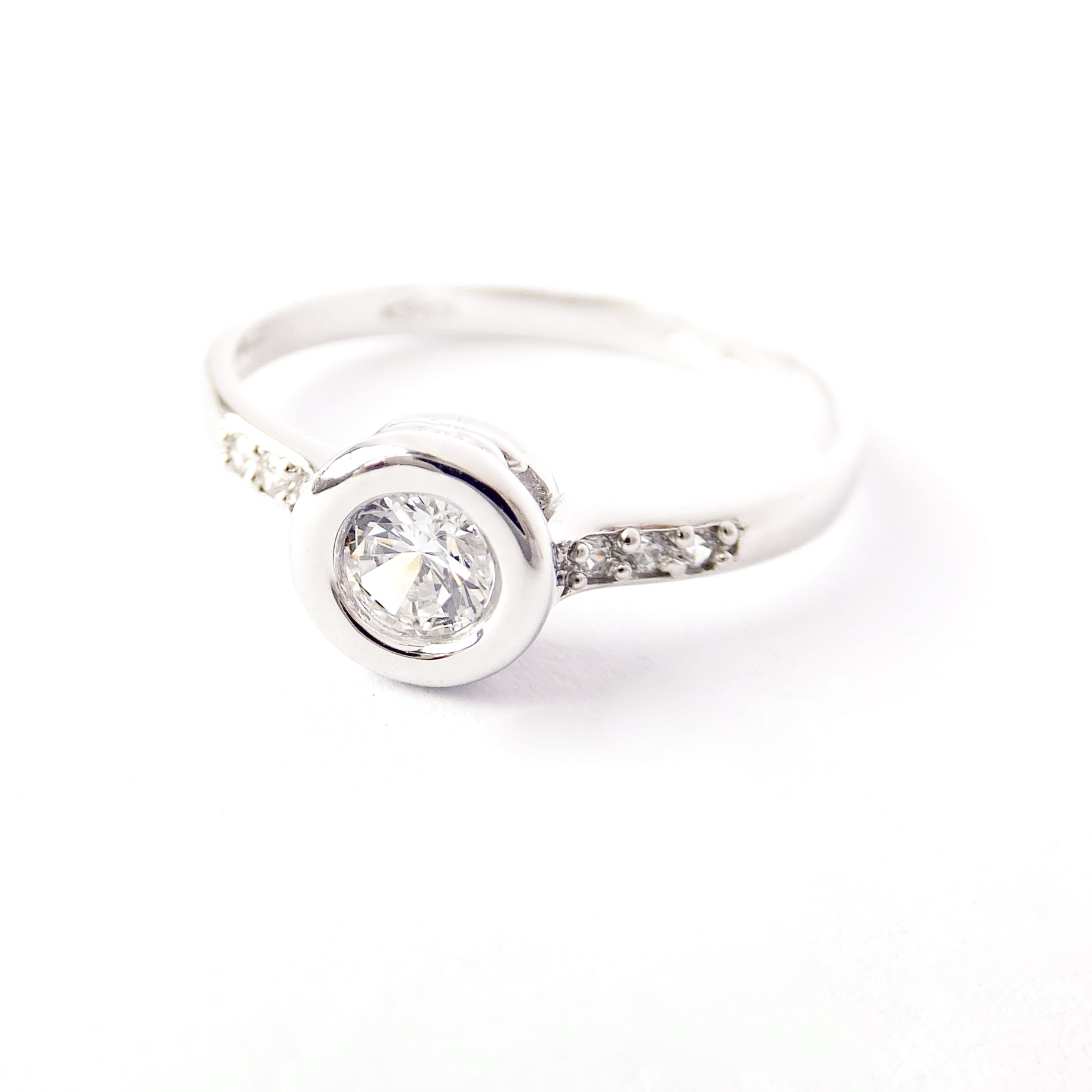 Luxusní lesklý prsten z bílého zlata. Prsten je dekorován čirými zirkony, které se dokonale třpytí.