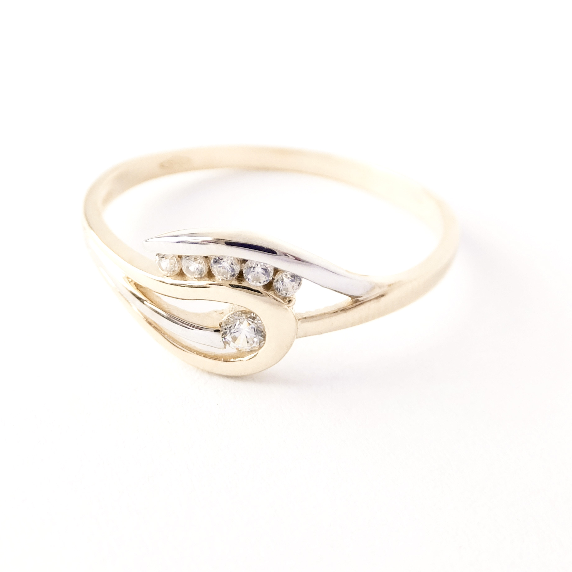 Zlatý lesklý prsten zdobený čirými zirkony.