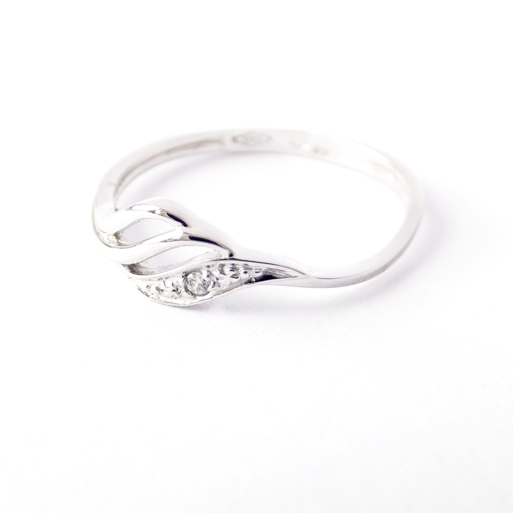 Krásný, lesklý prsten z bílého zlata doplněný drobným, čirým zirkonem.
