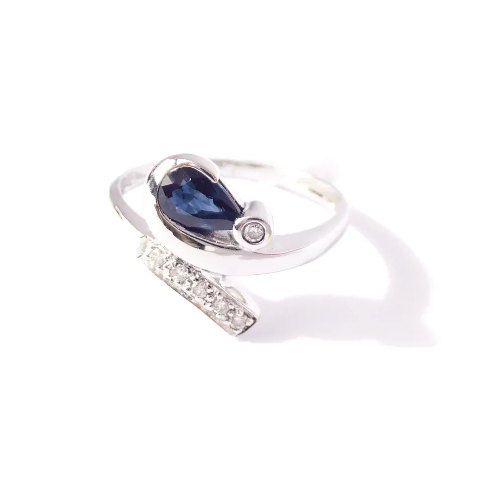 Dokonalý prsten z bílého zlata zdobený safírem a diamanty. Certifikát součástí. (upravovaná velikost prstenu)