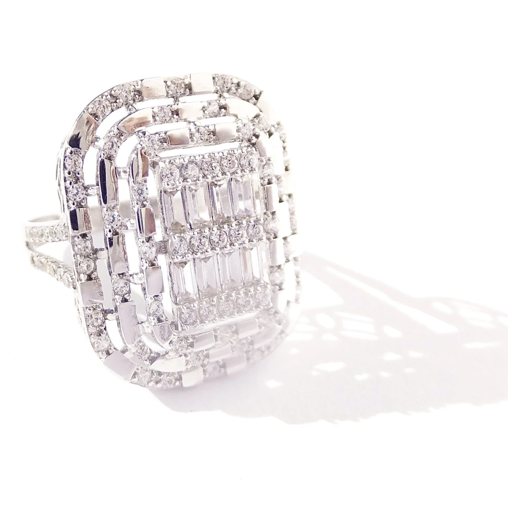 Výrazný prsten z bílého zlata zdobený čirými zirkony, které se dokonale třpytí.