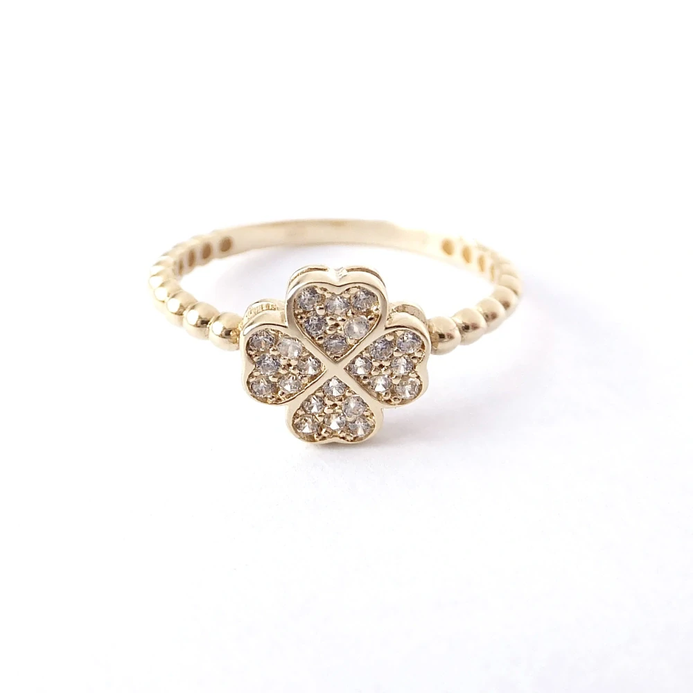 Darujte své nejbližší osobě tento nádherný zlatý doplněk v podobě prstenu ve tvaru čtyřlístku pro štěstí. Prsten je uprostřed vyplněný drobnými, čirými zirkony.