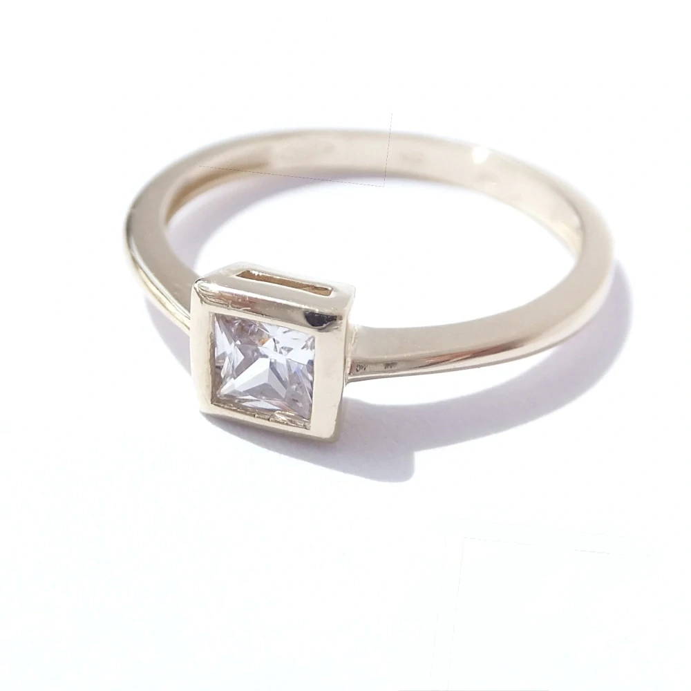 Elegantní zlatý prsten ve tvaru kostky doplněný čirým zirkonem.