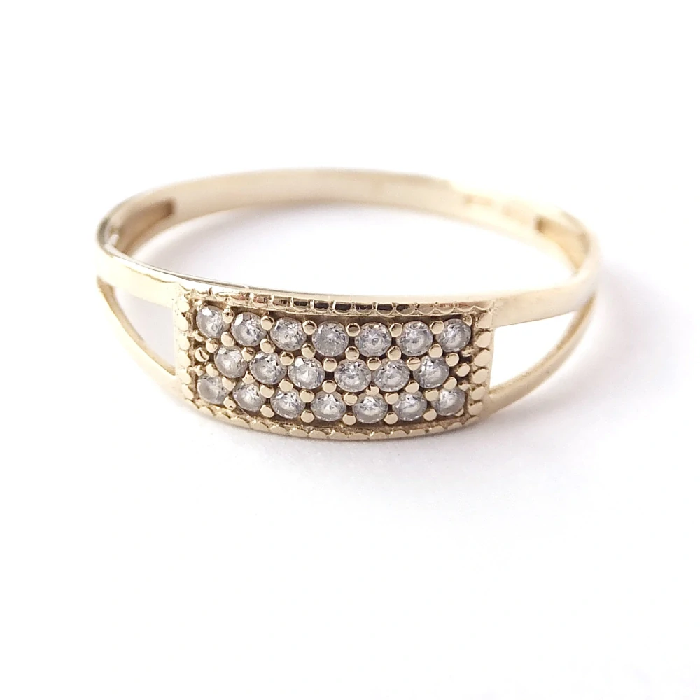 Elegantní zlatý prsten doplněný z přední strany čirými zirkony.
