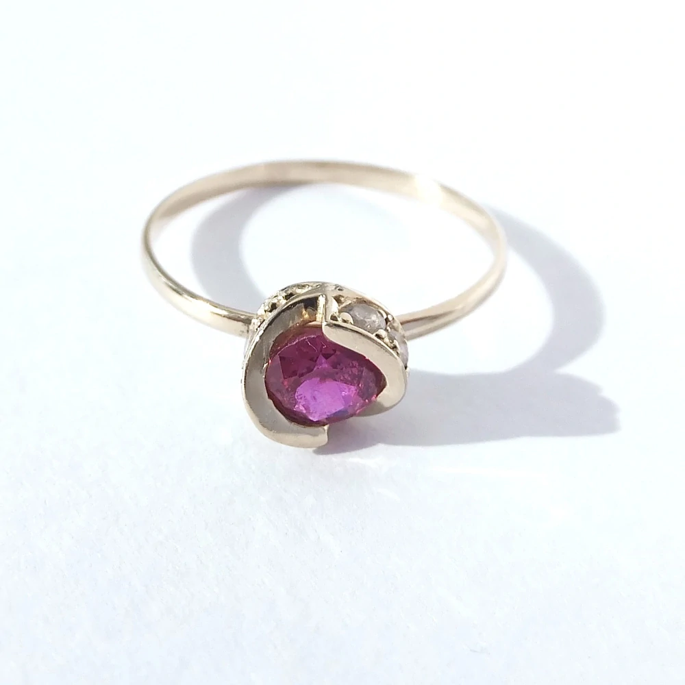 Jemný zlatý prsten doplněný sytě růžovým kamenem a čirými zirkony.